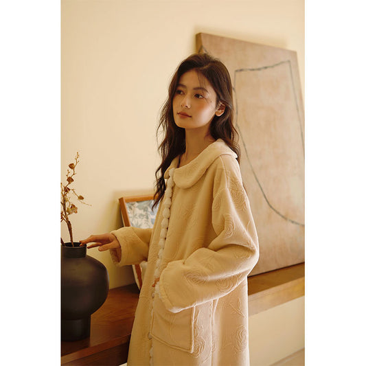 フリースお花ボタンと丸襟のふわふわルームウェア