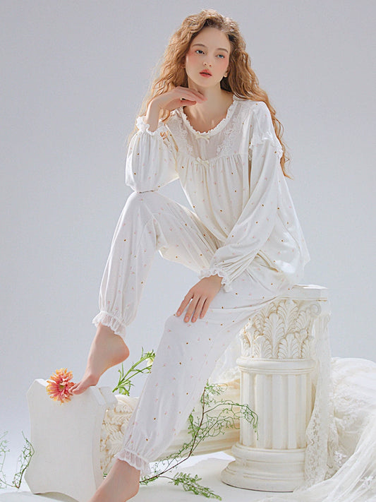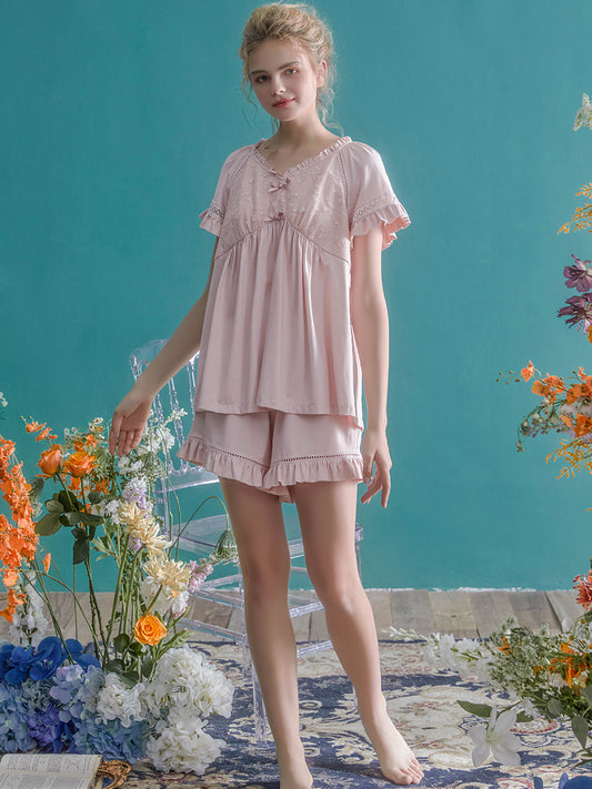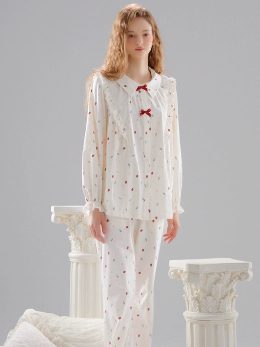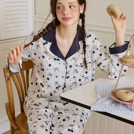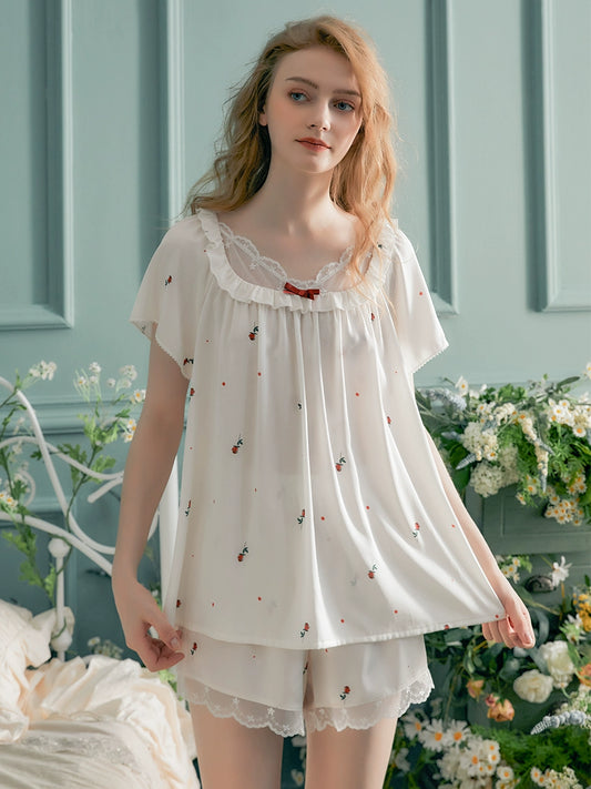 フルーツとリボンのラウンドネックビスコースパジャマ