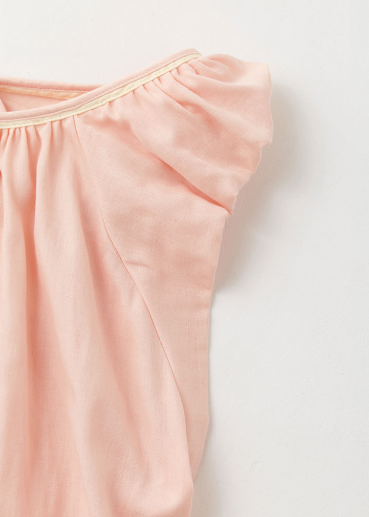 肩にあしらわれたギャザーとバックリボンが、どこか懐かしくて新しい愛らしさを演出します。