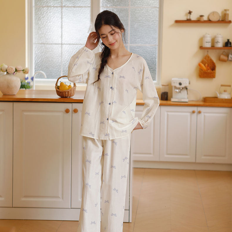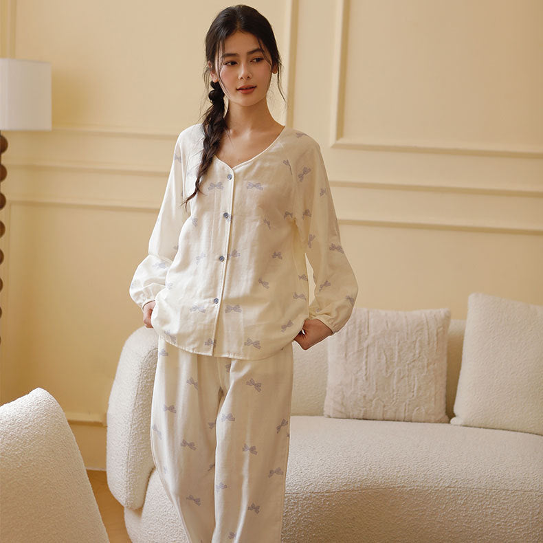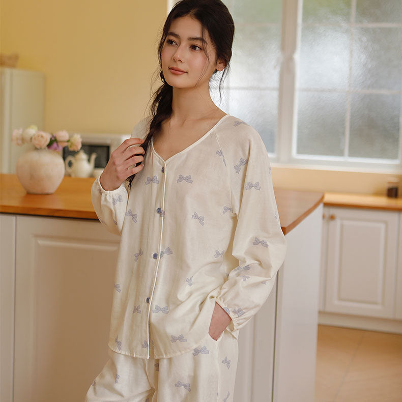 淡く揺れる、ブルーリボンの余韻。優しさに包まれるダブルガーゼパジャマ。