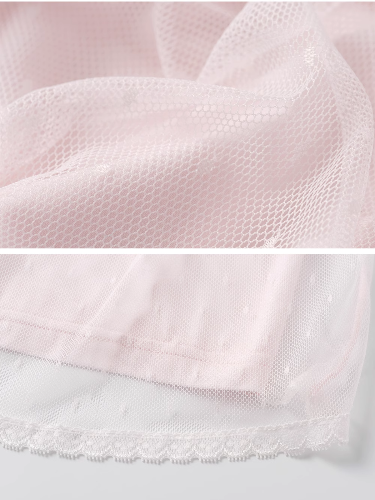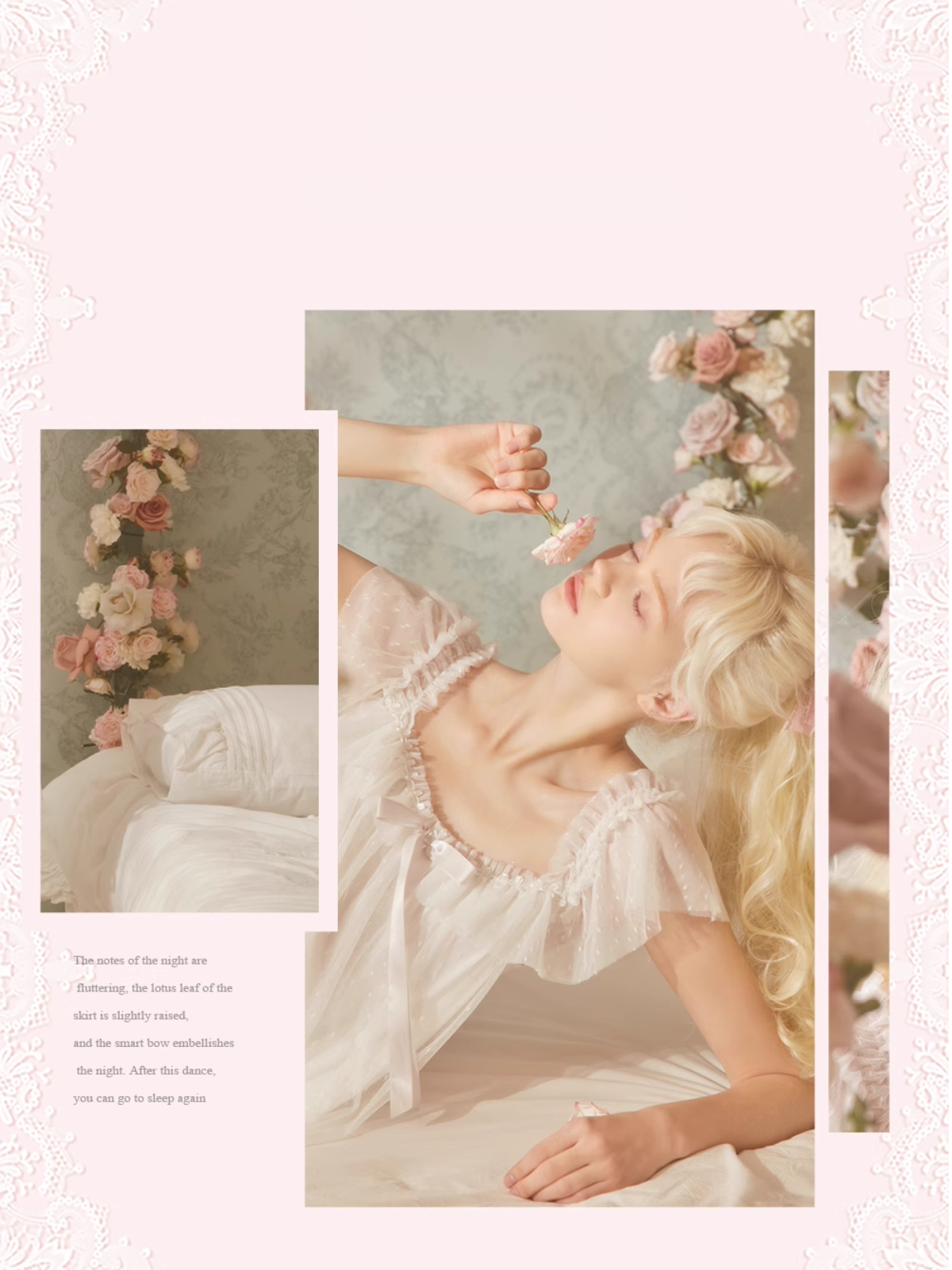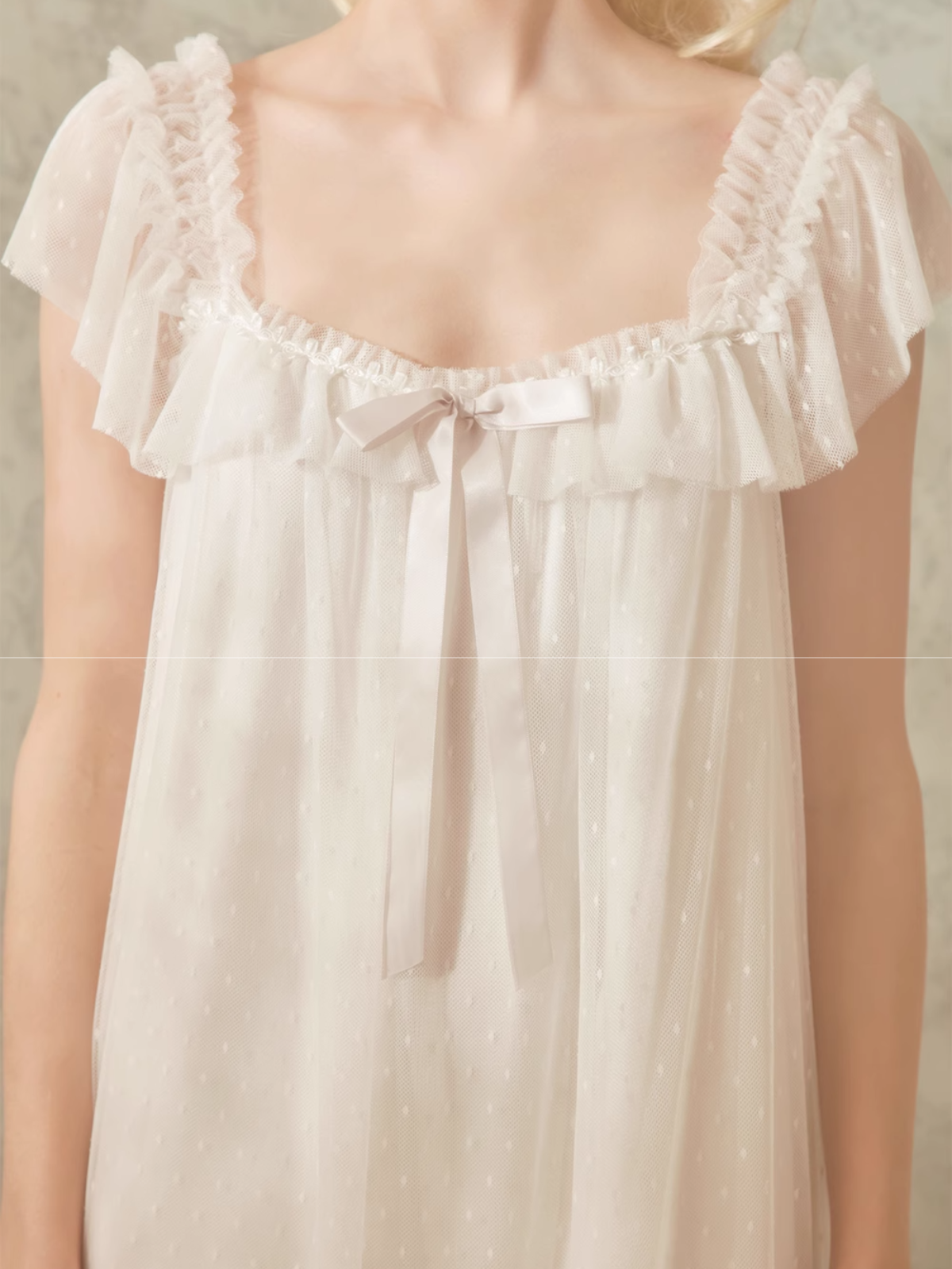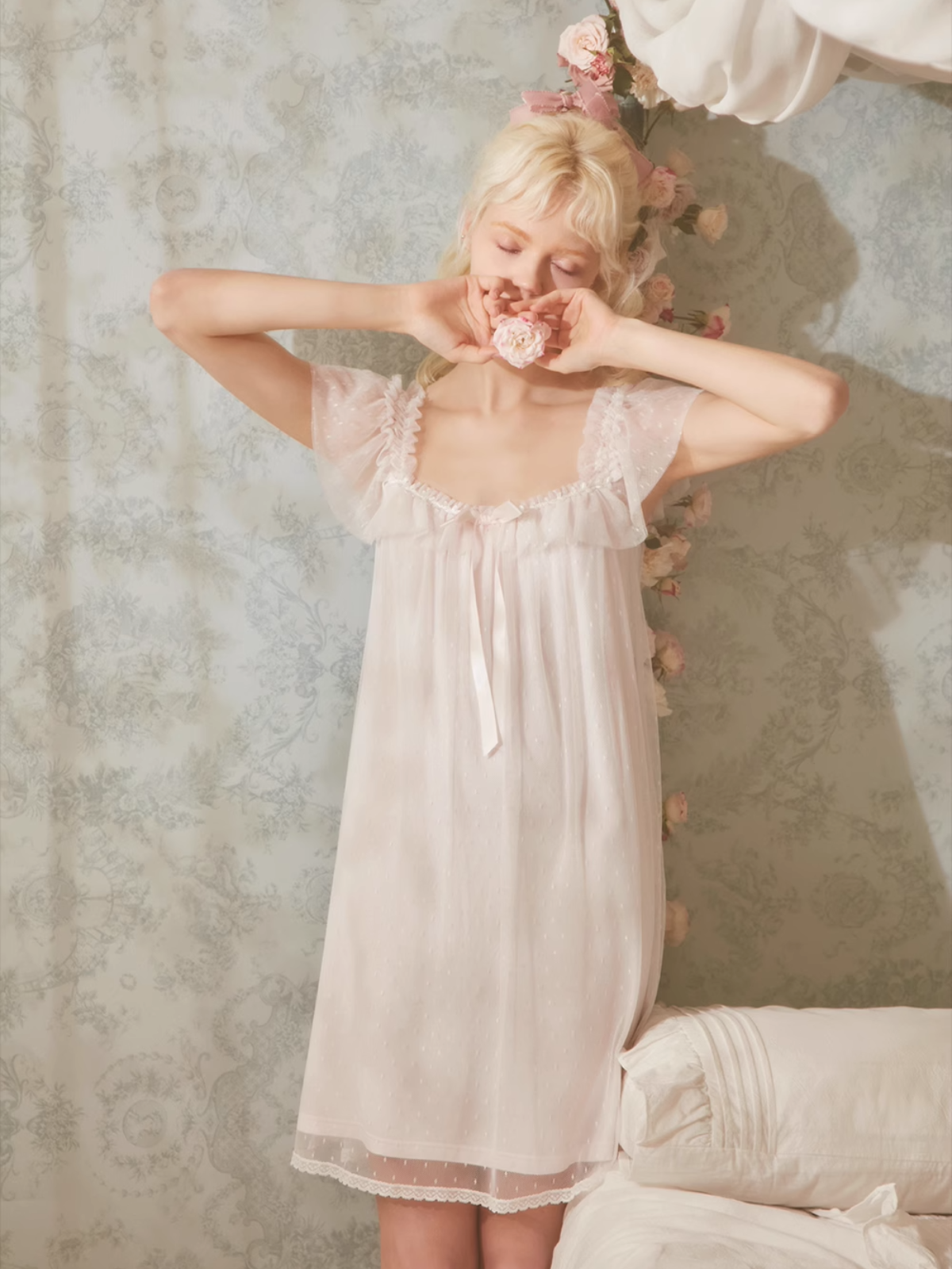 柔らかな光に包まれたような優美なネグリジェ。艶のある胸元のリボン、ふんわりとしたドット柄のレースが優しげな印象を与えます。カラーは清楚なホワイトと可愛らしいピンクの2色展開。