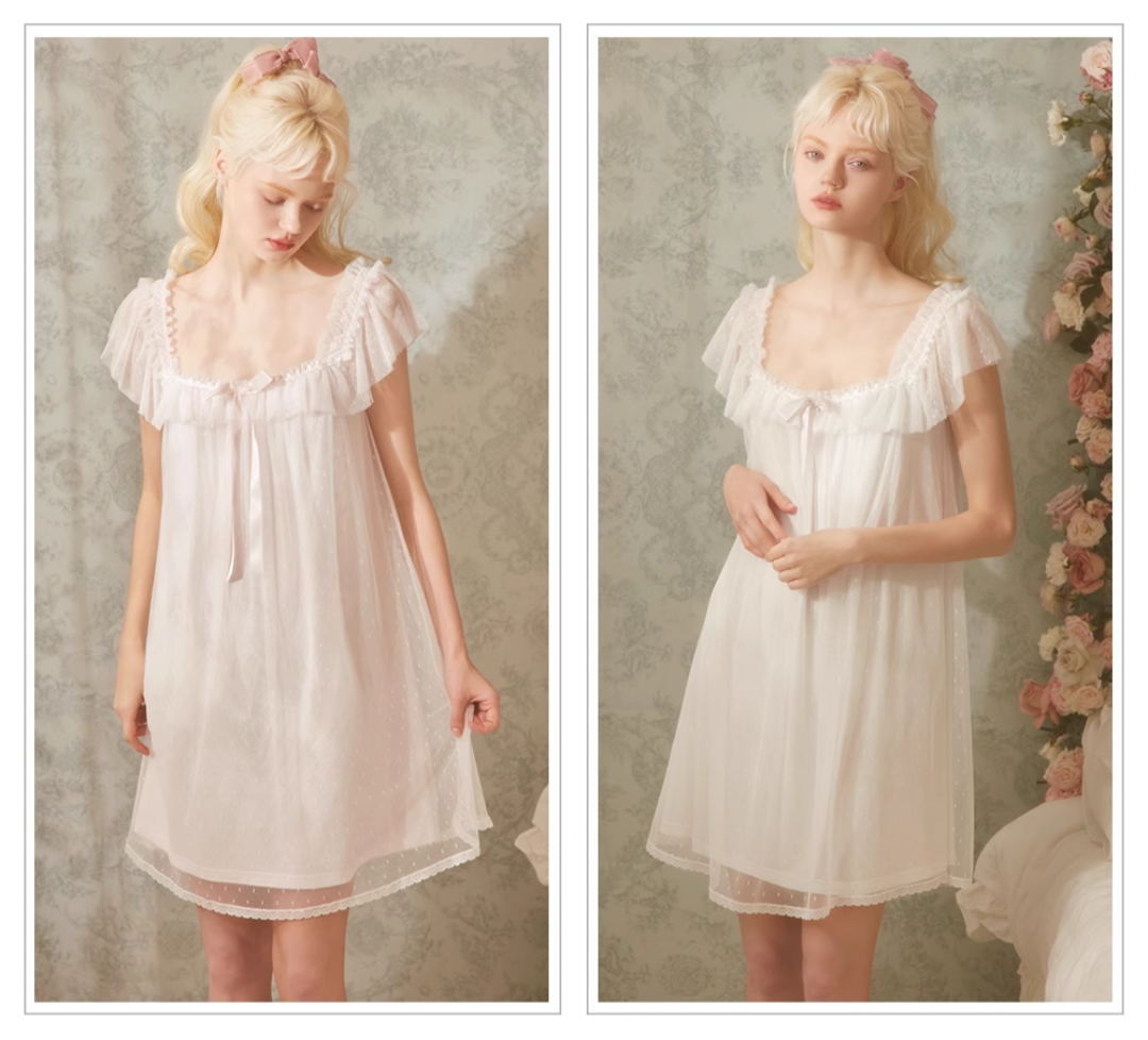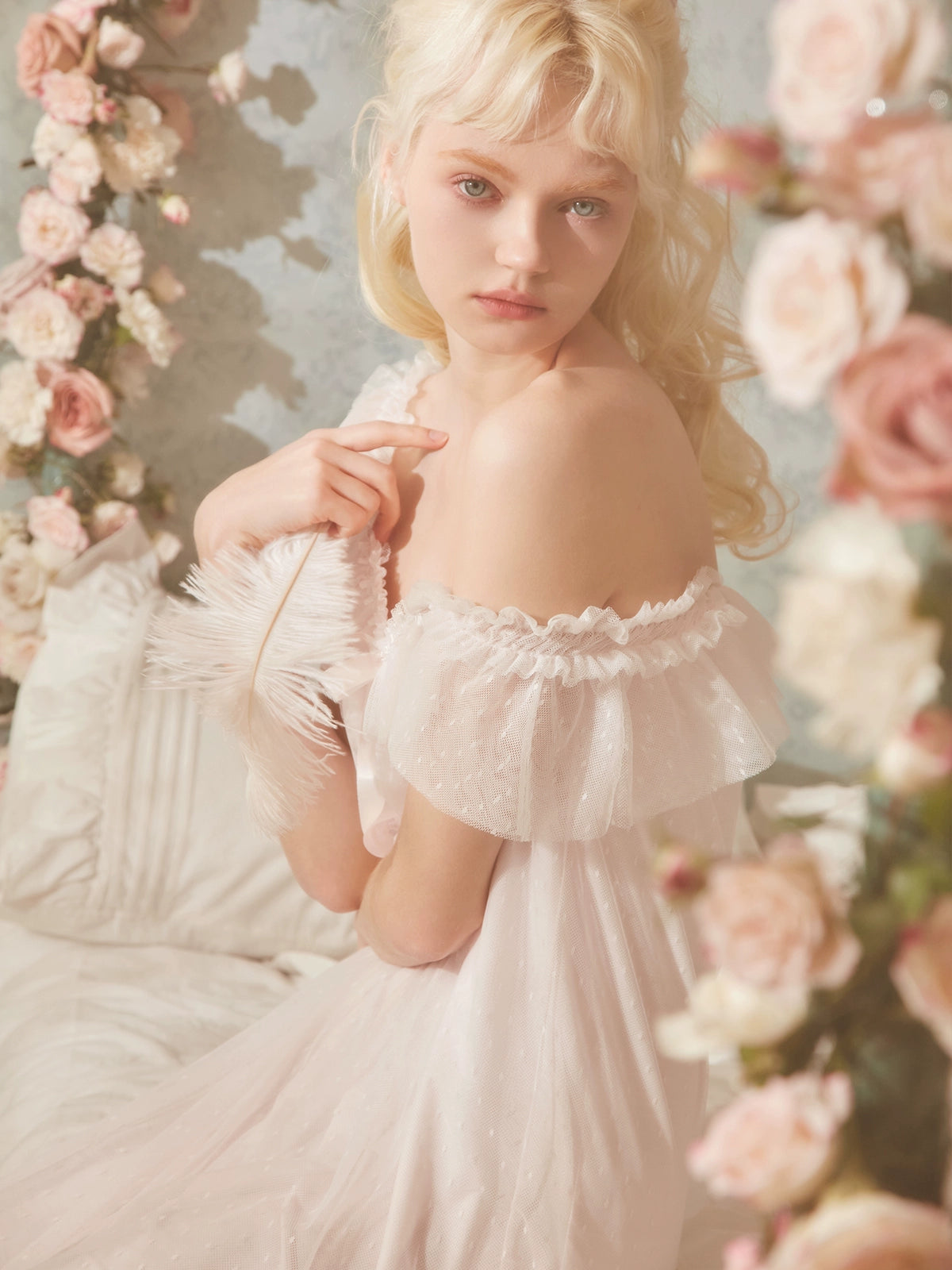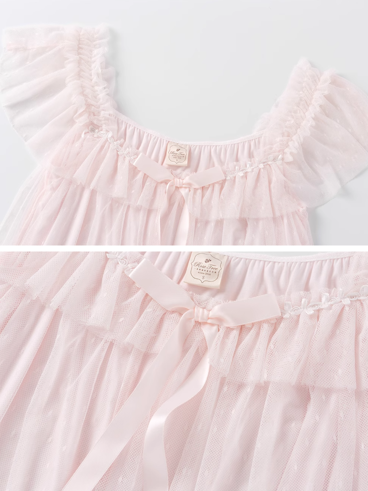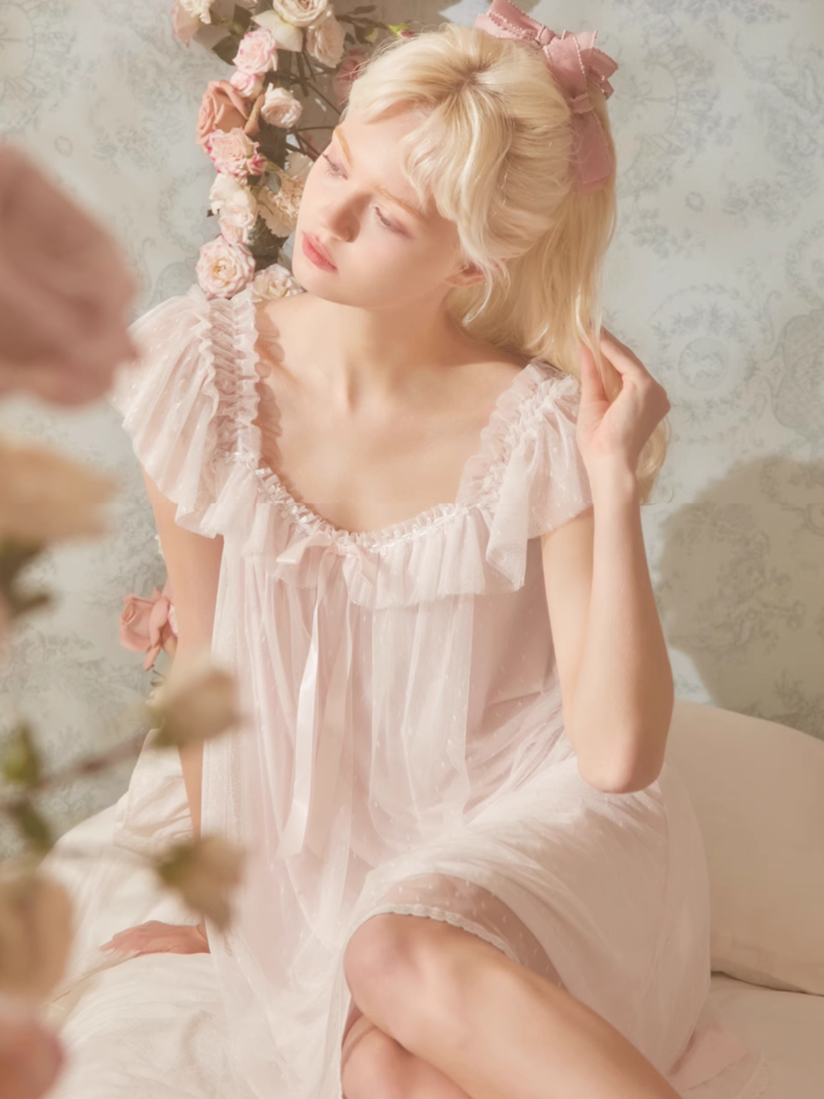 柔らかな光に包まれたような優美なネグリジェ。艶のある胸元のリボン、ふんわりとしたドット柄のレースが優しげな印象を与えます。カラーは清楚なホワイトと可愛らしいピンクの2色展開。