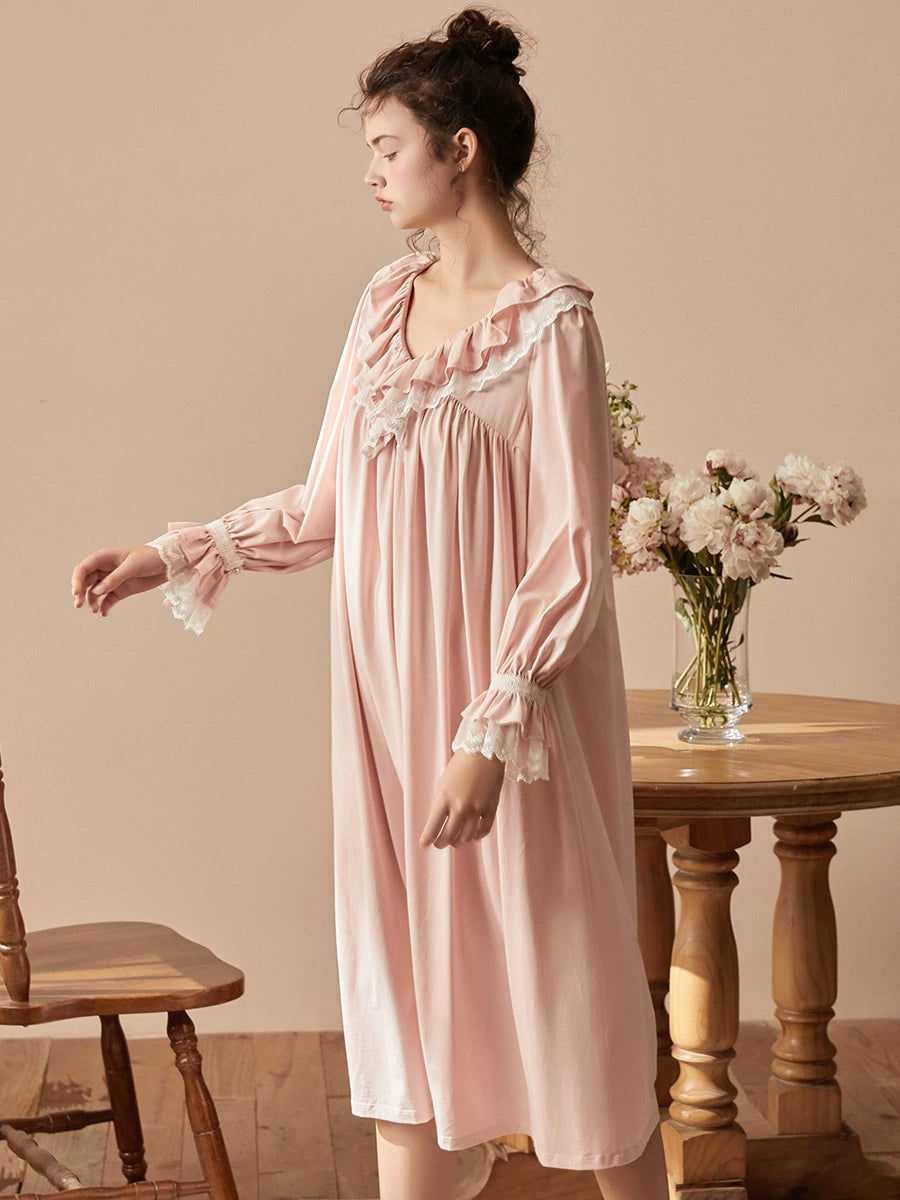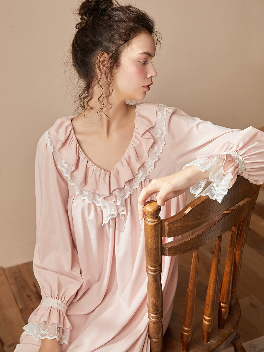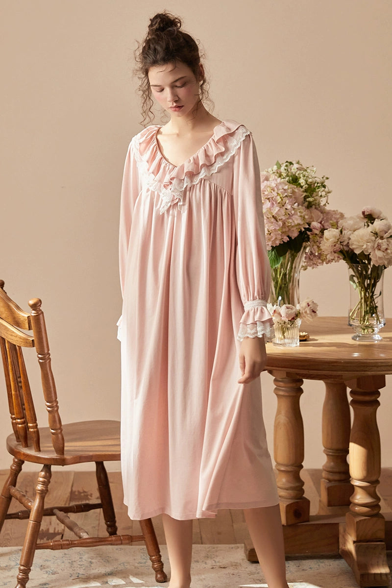 ほんのりピンクの色合いと、Vネックや袖口に贅沢にあしらわれたフリル&レースが、まさに大人のためのプリンセス気分を演出します。