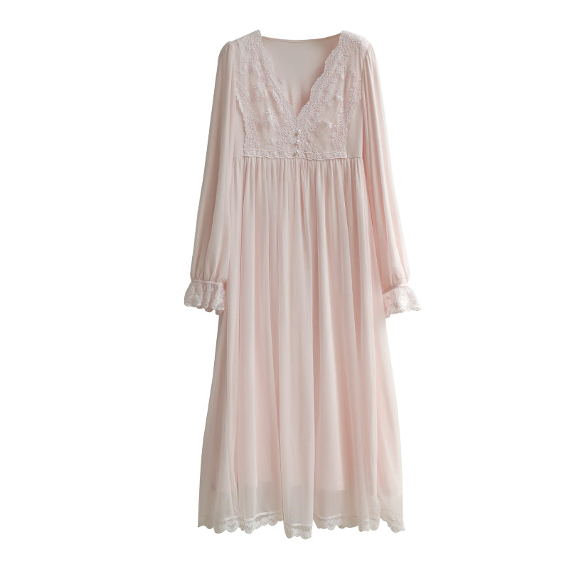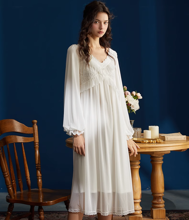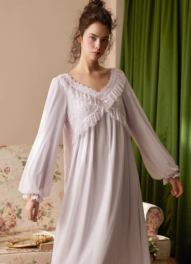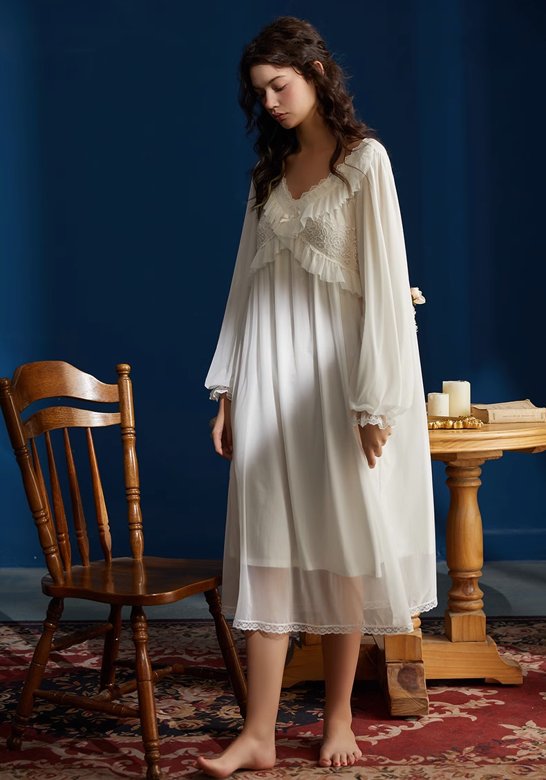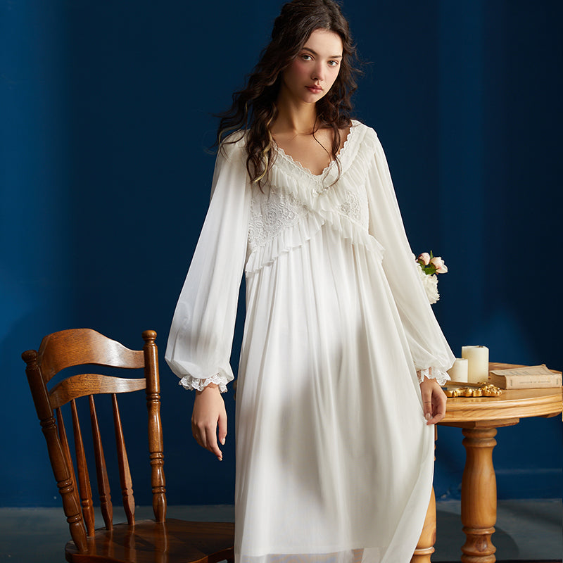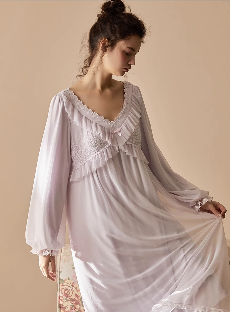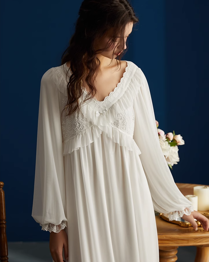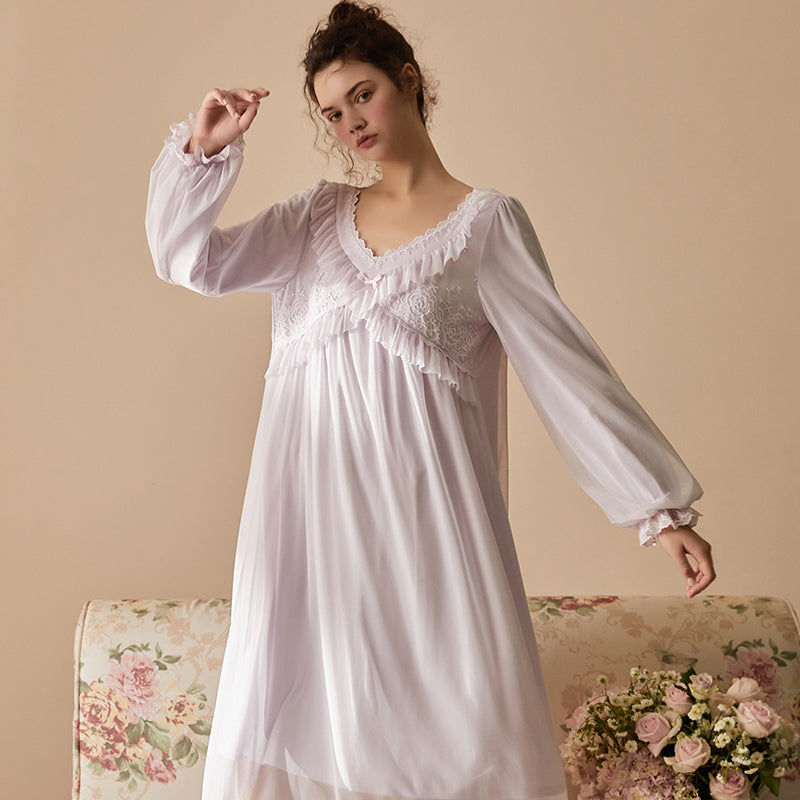フローラルレースとリボンが織りなす、スウィートでエレガントなネグリジェ。ゆったりとしたシルエットが優雅で気品のある雰囲気を演出してくれます。